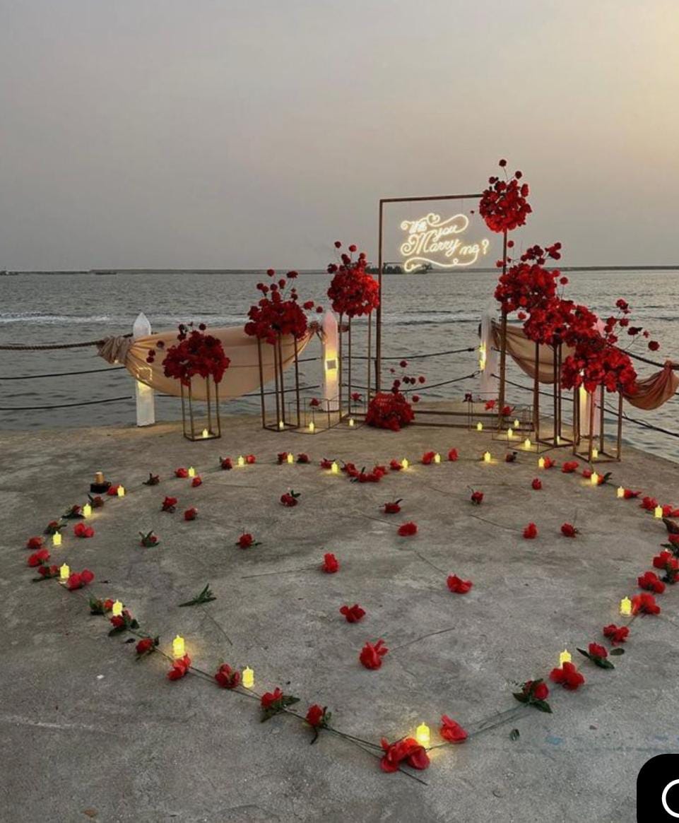 A carefully arranged proposal setup with romantic decorations and personalized touches, designed to turn your proposal into a memorable and picture-perfect experience.